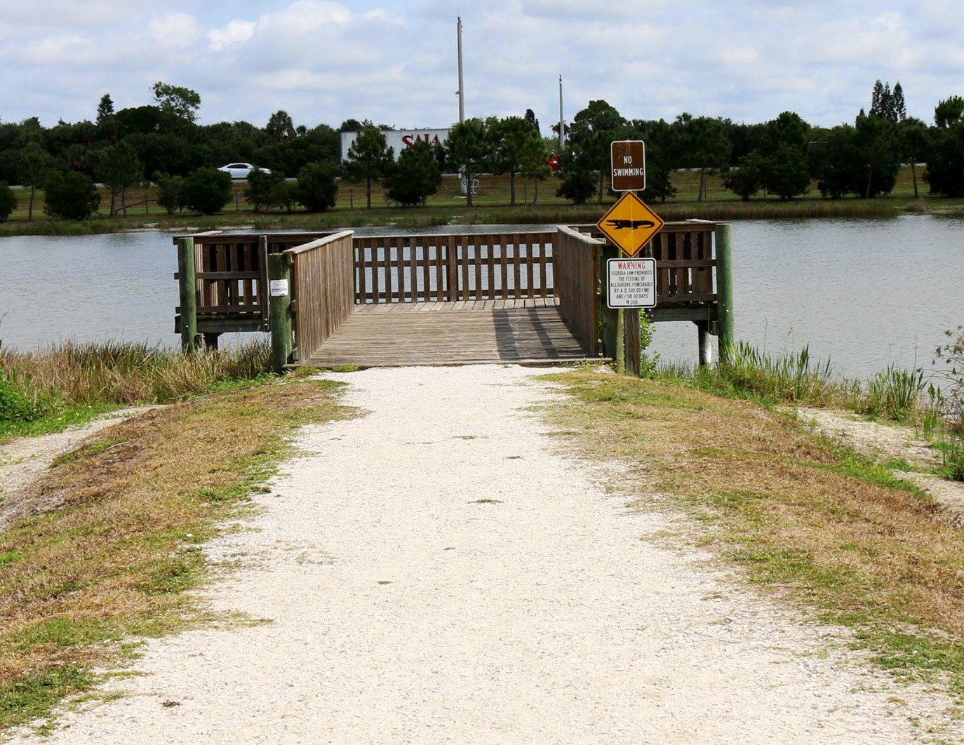 The fishing pier is accessible from both the Kay Road and 1st Avenue East entrances. For the closest access, use the parking lot near the playground.