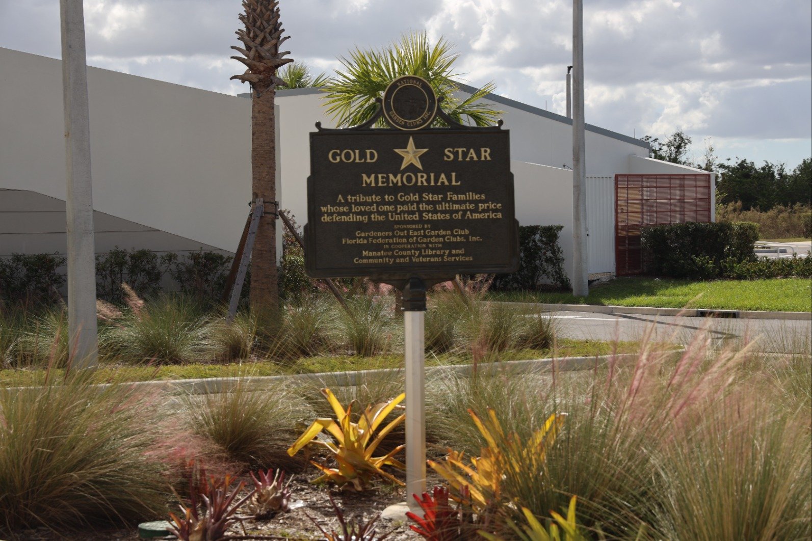The Gold Star Memorial marker at Lakewood Ranch Library, the 14th installed in Florida, was sponsored by the Gardeners Out East Club and dedicated on May 4, 2024. Speakers at the dedication included Tina Tuttle, president of the Florida Federation of Garden Clubs, Rosita Aristoff, Blue and Gold Star Memorial chairperson, and Stefenie Hernandez, the mother of Army Specialist Patrick L. Lay II, a Braden River High School graduate who died Aug. 11, 2011 while serving during Operation Enduring Freedom.