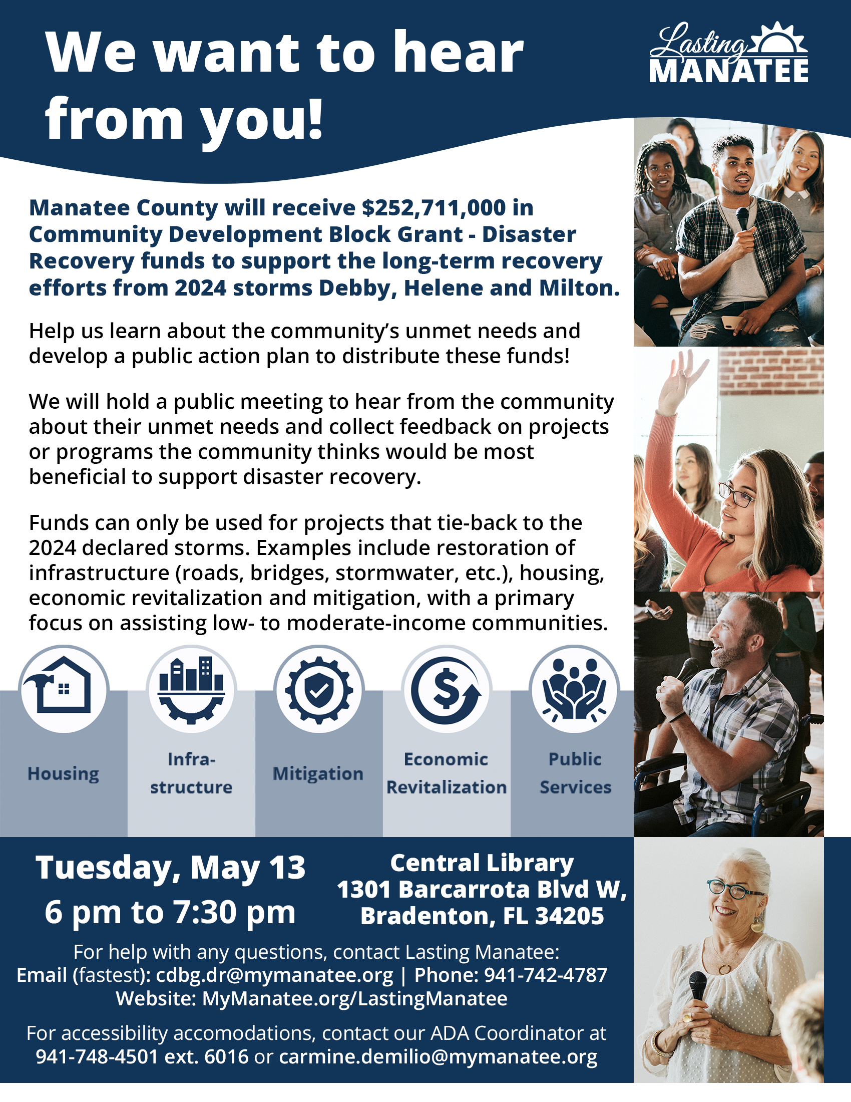 Manatee County will receive $252,711,000 in Community Development Block Grant - Disaster Recovery funds to support the long-term recovery efforts from 2024 storms Debby, Helene and Milton.