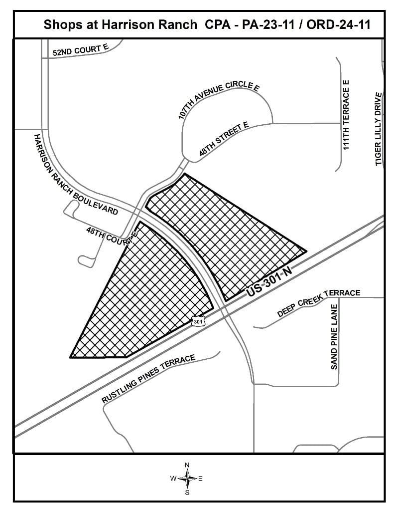 An Ordinance of the Board of County Commissioners of Manatee County, Florida, Regarding Comprehensive Planning; providing for a Purpose and intent; providing findings; providing for a Privately-Initiated Map Amendment to the Future Land Use Map of the Future Land Use Element to designate specific real property generally located at the northwest and northeast corners of U.S. 301 North and Harrison Ranch Boulevard, at 4605 and 4606 Harrison Ranch Boulevard, Parrish, Fl (Manatee County) from the RES-3 (Residential- 3 dwelling units per gross acre) (29.13± acres) and UF-3 (Urban Fringe - 3 dwelling units per gross acre) (1.01± acres) Future Land Use classifications to the ROR (Retail/Office/Residential) (30.14± acres) Future Land Use Classification; Providing for a specific property development condition in the text of the Comprehensive Plan to limit the maximum density potential to 320 dwelling units inclusive of any density bonus provisions as voluntarily proffered by the applicant and; Providing for a specific property development condition in the text of Element 2, Future Land Use Element, Policy 2.14.1.23/D.5.23 to limit maximum non-residential intensity to 300,000 square feet as may be modified pursuant to an approved land use equivalency matrix that may allow for partial conversion to residential uses as voluntarily proffered by the applicant and; setting forth findings; providing for a legal description; providing for severability; and providing an effective date.