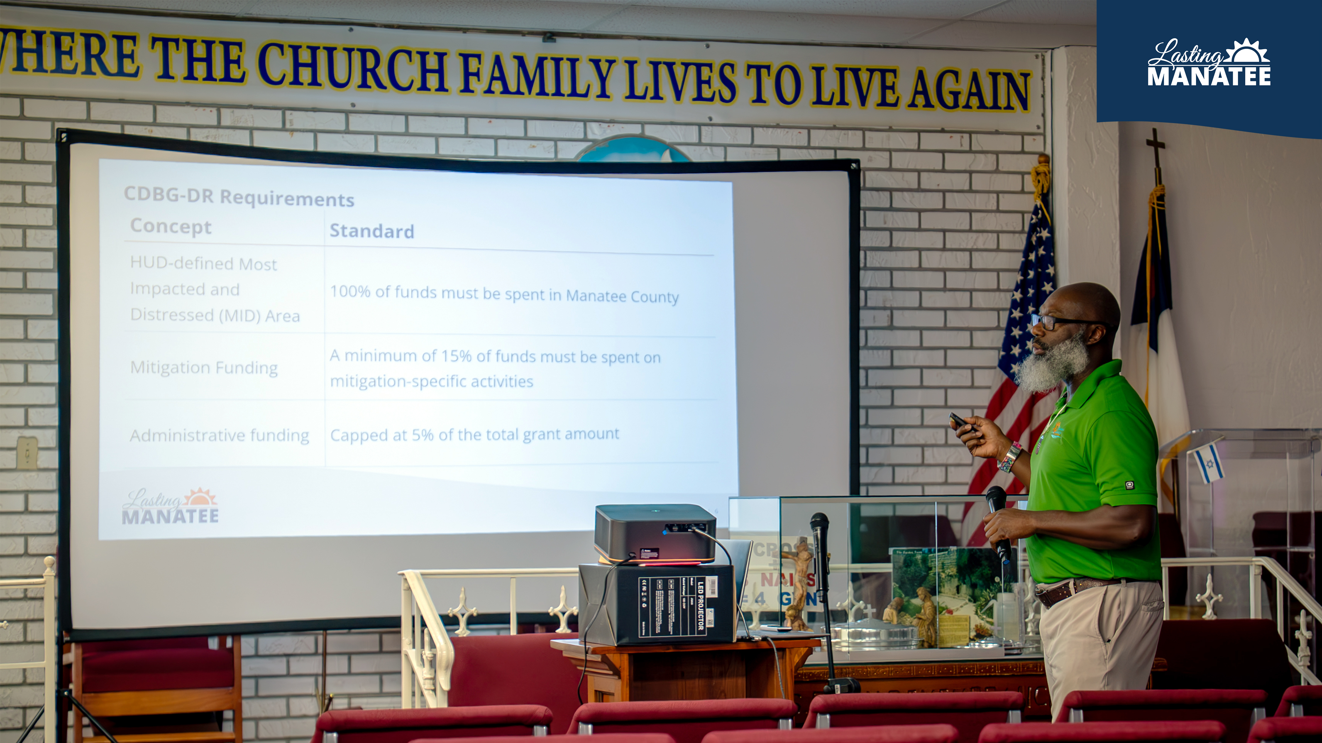 On Tuesday, June 12, we held the final public hearing for our CDBG-DR Draft Action Plan, which was welcomed by a strong turnout at Eternity Temple Church in Palmetto. This event was a meaningful close to our series of in-person public hearings and workshops for residents to engage with Lasting Manatee and to share comments that aim to shape our County’s post-hurricane recovery.