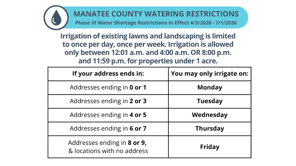 If you have additional water restrictions questions, contact us by sending an email to Manatee County Water Conservation at [email protected], or to SWFWMD at [email protected] or by calling 1-800-836-0797 (FL only) or (813) 856-5679 (during business hours).