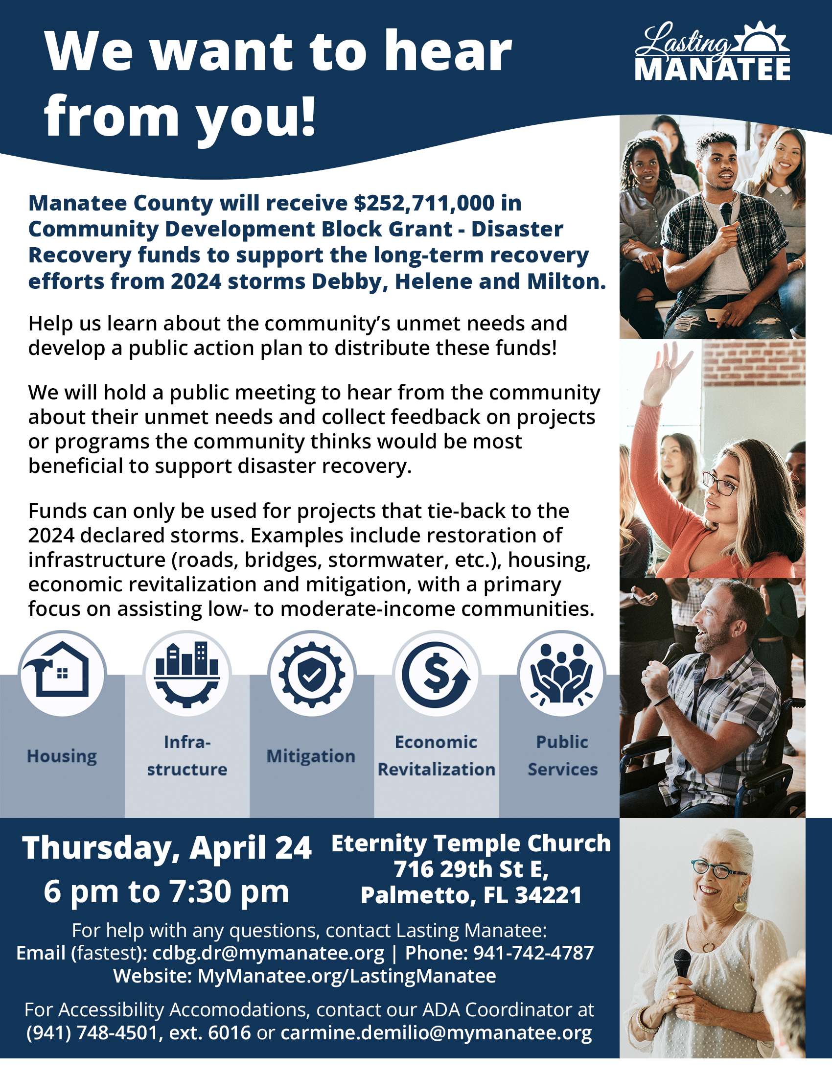Lasting Manatee's first of multiple Community Input Meetings has been scheduled. The meeting will take place on Thursday, April 24, from 6pm to 7:30pm at Eternity Temple Church - 716 29th St E, Palmetto, FL 34221.