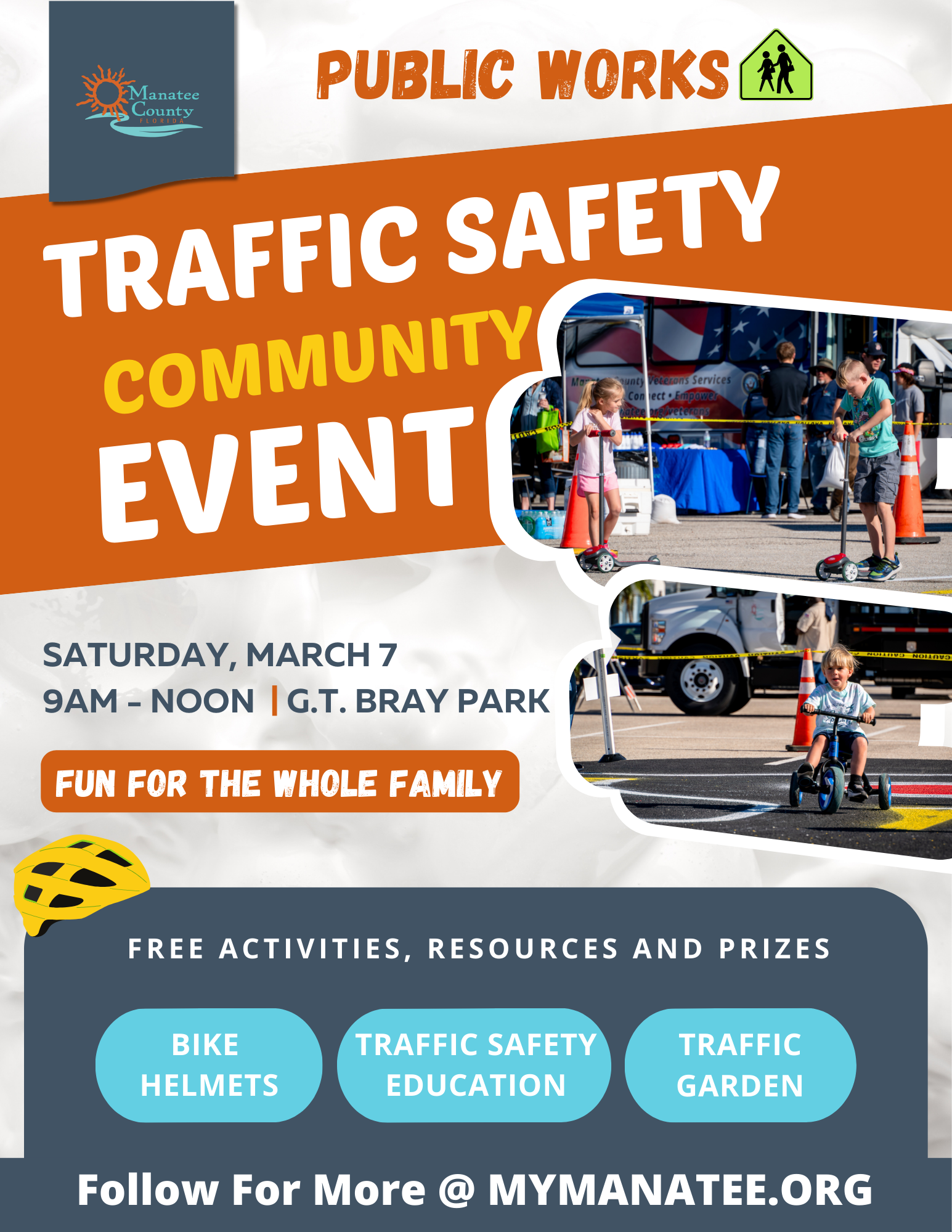 Join Manatee County Traffic Safety Community Events for fun, interactive experiences designed to keep our roads safe and our community connected. These FREE, family-friendly events feature hands-on activities, safety demonstrations, valuable traffic resources, exciting prizes, a kid-approved traffic garden, ice cream, and plenty of fun for all ages. Come out, learn something new, and help us build a safer Manatee County—together!