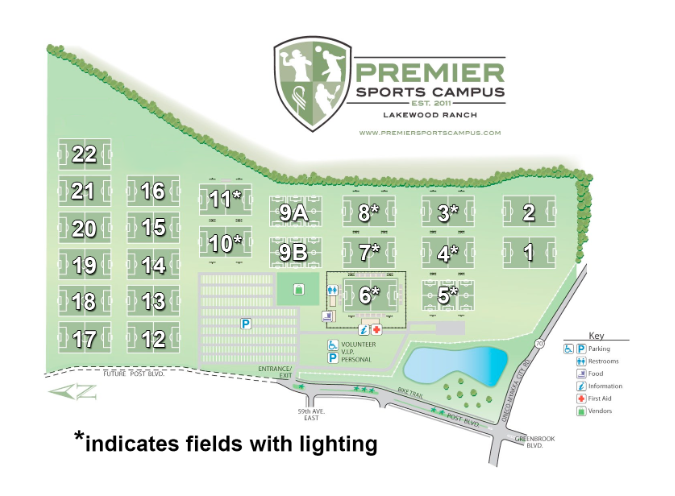 Premier Sports Campus is a public rental facility for hosting large sporting events, which must be booked through our sales office. If you wish to explore nearby community parks with sports facilities, we recommend Greenbrook Park (6655 Greenbrook Boulevard) or Lakewood Ranch Park (5350 Lakewood Ranch Blvd). For attendance at a scheduled Premier Sports Campus event, please refer to our calendar of events.