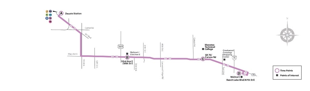 | DESOTO STATION/ 301 BLVD | 53RD AVE EAST/ 30TH ST EAST | SR 70/ CARUSO RD | RANCH LAKE BLVD/ 87TH ST EAST |