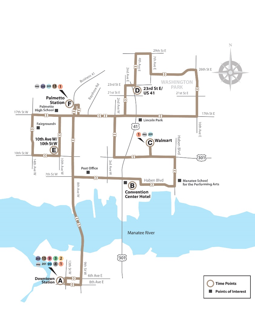 | DOWNTOWN STATION | CONVENTION CENTER HOTEL | WALMART PALMETTO | 23RD ST EAST/ 10TH ST WEST | 10TH AVE WEST/ 10TH ST WEST | PALMETTO STATION |