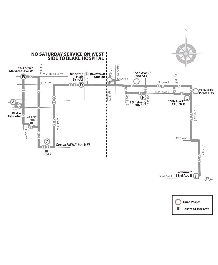 | BLAKE HOSPITAL | 59TH ST/ MANATEE AVE WEST | CORTEZ RD WEST/ 47TH ST WEST | MANATEE HIGH SCHOOL/ 9TH AVE WEST | DOWNTOWN STATION | 13TH AVE EAST/ 9TH ST EAST | 13TH AVE EAST/ 27TH ST EAST | WALMART/ 53RD AVE EAST |