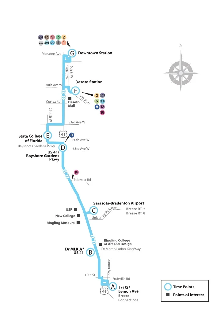| Block / Service Provider | SARASOTA DOWNTOWN STATION 1ST AND LEMON AVE | US 41 @ MARTIN LUTHER KING JR WAY | SARASOTA BRADENTON AIRPORT | 14TH ST WEST/ BASHORE GARDENS PKWY | STATE COLLEGE OF FLORIDA/ 26TH ST WEST | MCAT DESOTO STATION | MCAT DOWNTOWN STATION |